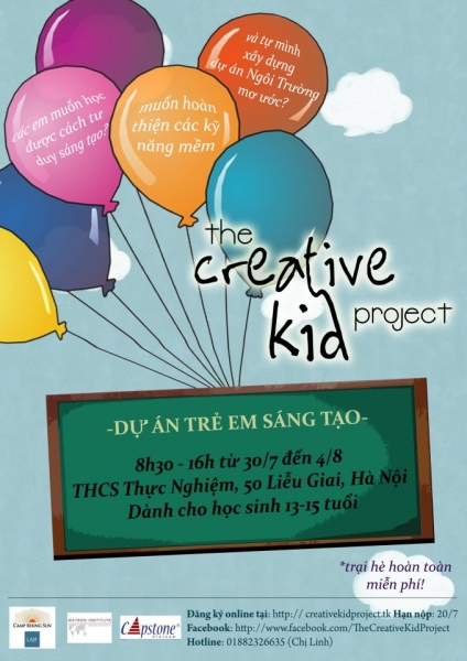 CKP (The Creative Kid Project)là một dự án phi lợi nhuận mang tính giáo dục thuần túy, tập trung phát triển tiềm năng sáng tạo của trẻ em, vì mục đích xây dựng một thế hệ mới trong tương lai, hướng tầm nhìn của học sinh Việt ra toàn cầu. Theo đó, 30 em học sinh với độ tuổi từ 13 đến 15 từ các trường cấp II trên địa bàn Hà Nội, sẽ được tuyển chọn thông qua đơn đăng ký gửi về BTC để tham gia vào chương trình diễn ra từ 30/7 - 4/8/2012 tại PTCS Thực Nghiệm, Ba Đình, Hà Nội.