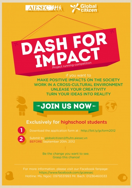 “Dash for Impact” là cuộc thi thuộc dự án Global Citizen 2012, trực thuộc AIESEC Đại học Ngoại Thương Hà Nội (AIESEC FTU HN). AIESEC là tổ chức sinh viên lớn nhất thế giới, thành lập năm 1948 và xuất hiện trên hơn 110 quốc gia; là môi trường quốc tế và là nền tảng cho giới trẻ phát hiện cũng như phát triển tiềm năng của mình từ đó tạo nên những tác động tích cực cho xã hội. Là một chi nhánh của AIESEC Vietnam, được thành lập vào năm 2009, với tuổi đời còn rất trẻ, AIESEC FTU HN đã vươn lên và phát triển không ngừng. Chắc hẳn đã có nhiều Amsers từng biết tới các hoạt động, sự kiện của AIESEC FTU HN, tiêu biểu là GLAD (Global Leadership Activating Day) diễn ra rất thành công vào ngày 1/9/2012 vừa qua.