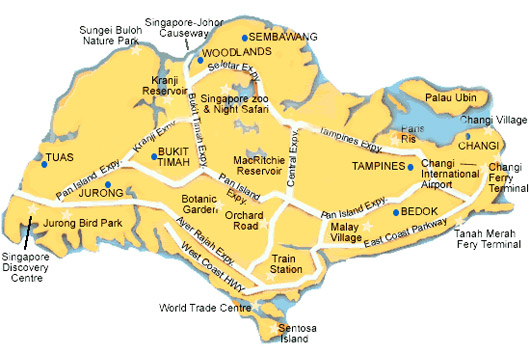 Singapore là một hòn đảo có hình dạng một viên kim cương bao quanh bởi nhiều đảo nhỏ khác. Có hai con đường nối giữa Singapore và bang Juhor của Malaysia— một con đường nhân tạo có tên Đường nối Johor-Singapor ở phía Bắc, băng qua eo biển Tebrau và chỗ nối thứ hai Tuas, một cầu phía Tây nối với Juhor. Đảo Jurong, Pulau Tekong, Pulau Ubin và Sentosa là những đảo lớn nhất của Singapore, ngoài ra còn có nhiều đảo nhỏ khác. Vị trí cao nhất của Singapore là đồi Bukit Timah với độ cao 166 m.