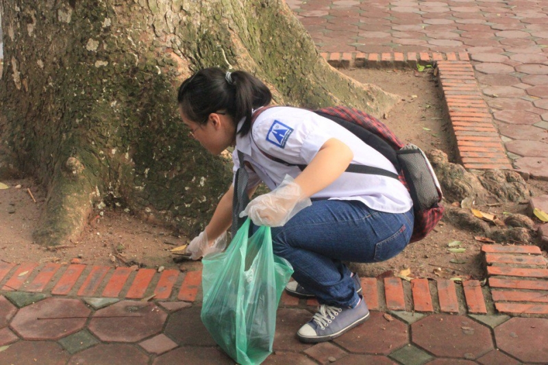 Hồ Gươm mới 6h sáng đã tập nấp người và xe cộ. Đúng 6h30’, tất cả mọi người đã có mặt đầy đủ tại “Hàm Cá Mập”; găng tay, chổi, túi nilon,…đều đã sẵn sàng. Cả lớp bắt đầu “hành quân” một vòng quanh bờ hồ. Ban đầu, bọn tớ cũng đôi chút ngại ngần trước ánh nhìn kì lạ và tò mò của những người xung quanh nhưng nhanh chóng, cảm giác ấy bị xóa dần đi, mọi người đều thấy vui vẻ, thoải mái.Người cầm chổi quét, người hót rác, người nhặt bằng tay…ai ai cũng hào hứng và bận rộn với công việc của mình. Nào là vỏ kẹo, vỏ bim bim, vỏ túi nilon, nhiều nhất là phải kể đến những que kem và mẩu thuốc là dưới các gốc cây. Mới chỉ đi nửa vòng Hồ Gươm thôi mà đã nhặt gần đầy các túi rác rồi. May mắn là thời tiết mát mẻ nên công việc cũng thực hiện nhanh chóng.