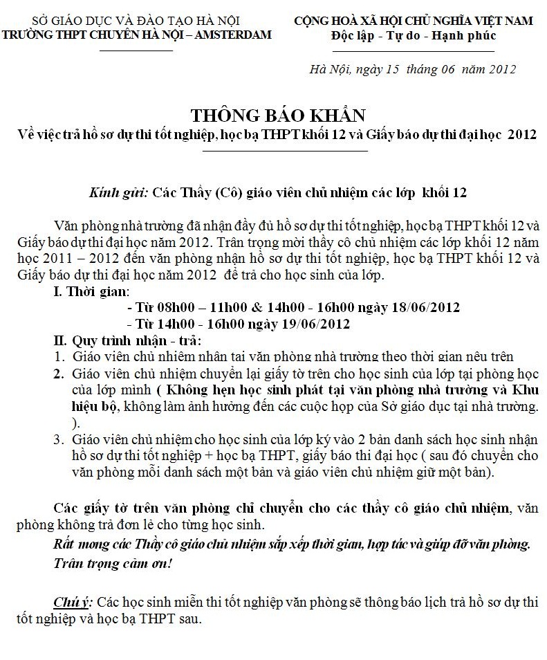 Thông báo khẩn về việc trả hồ sơ thi Tốt nghiệp, học bạ THPT và giấy báo dự thi Đại học năm 2012