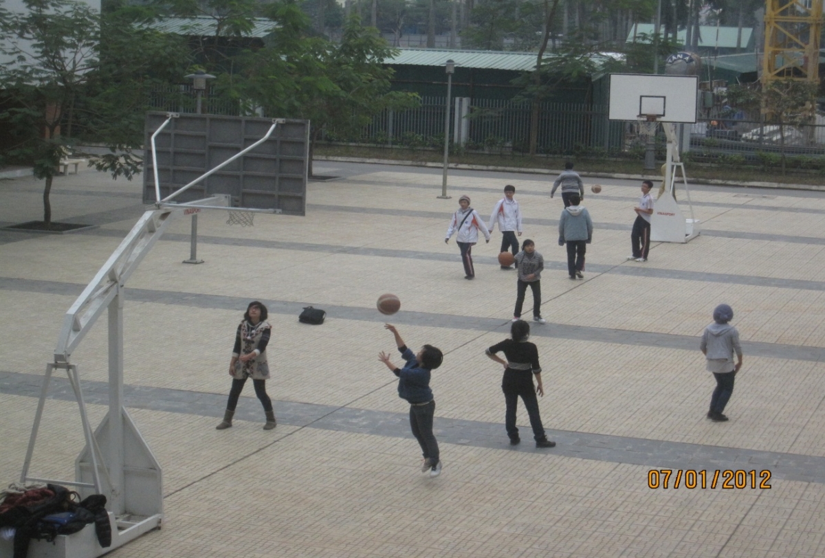 Tuy đã có nhà thể chất và sân bóng rổ riêng nhưng để phục vụ nhu cầu thể dục thể thao của các Amser, tạo điều kiện cho nhiều bạn đam mê thể thao đặc biệt là bóng rổ có thể rèn luyện và học tập môn thể thao mình yêu thích, trường đã quyết định đặt thêm 2 rổ bóng ở sân trường.Nhìn vào bức ảnh trên các bạn cũng thấy, một môn thể thao như bóng rổ không hẳn chỉ có các bạn nam yêu thích và đó cũng chính là cở sở để các bạn nữ có cơ hội thể hiện mình là những cô gái cá tính khỏe khoắn nhưng cũng không kém phần nữ tính khi chọn lấy niềm đam mê của mình. Cầm trên tay quả bóng rổ và nhìn sang mắt đồng đội, những cô gái ấy, những bạn nữ đến từng các lớp, các khối khác nhau đã bắt được ý nhau, ném cho nhau cái tinh thần đoàn kết để đưa được quả bóng vào rổ cũng như từ đó các bạn có thể làm quen, trao đổi học tập. Thật đúng như một gia đình.