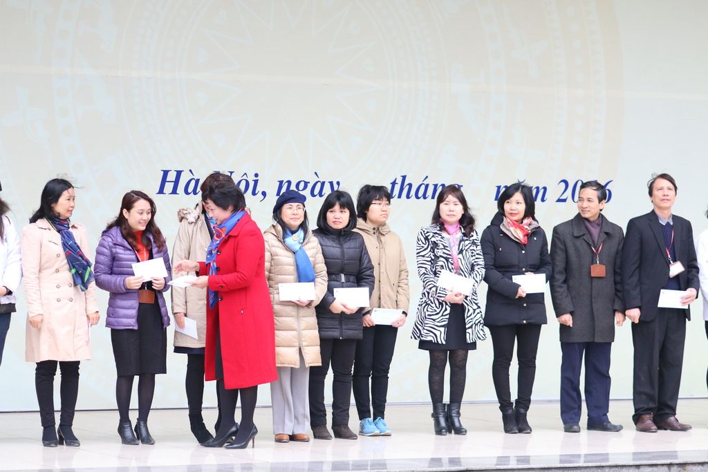 Nhà giáo Lê Thị Oanh - Bí thư Đảng ủy, Hiệu trưởng Nhà trường trao thưởng cho các giáo viên phụ trách và giáo viên dạy đội tuyển có học sinh đạt giải Nhất trong kì thi HSG Quốc gia 2016