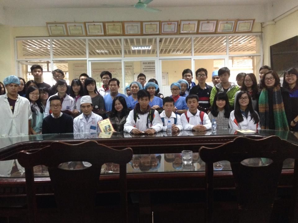 Đặt chân đến địa điểm, các bạn học sinh và các thầy cô giáo cùng nhau chụp một tấm ảnh lưu niệm. Sau đó, dưới sự hướng dẫn tận tình của các bác sĩ, mọi người xếp hàng nối đuôi nhau vào thăm phòng giao ban trong khu Hồi Sức Cấp Cứu. Tại đây, chúng tôi được gặp gỡ bác sĩ Nguyễn Viết Lượng – Chính ủy Bệnh viện – một người đã có nhiều năm kinh nghiệm trong nghề y, được lắng nghe những tâm sự hết sức thân tình và chân thành của bác.