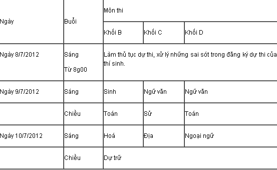 8h00 ngày 8/7/2012 (đối với thí sinh thi khối B, C, D, T, N, H, M, R, K);