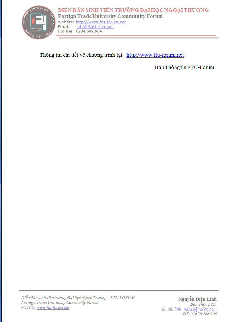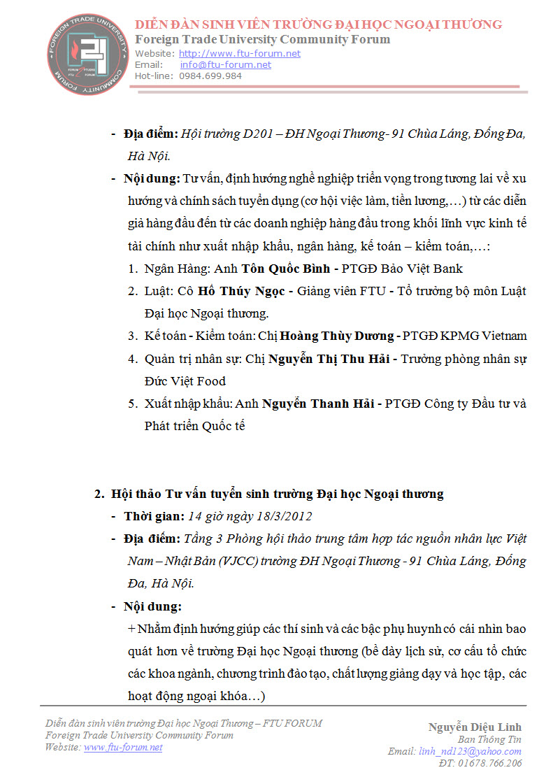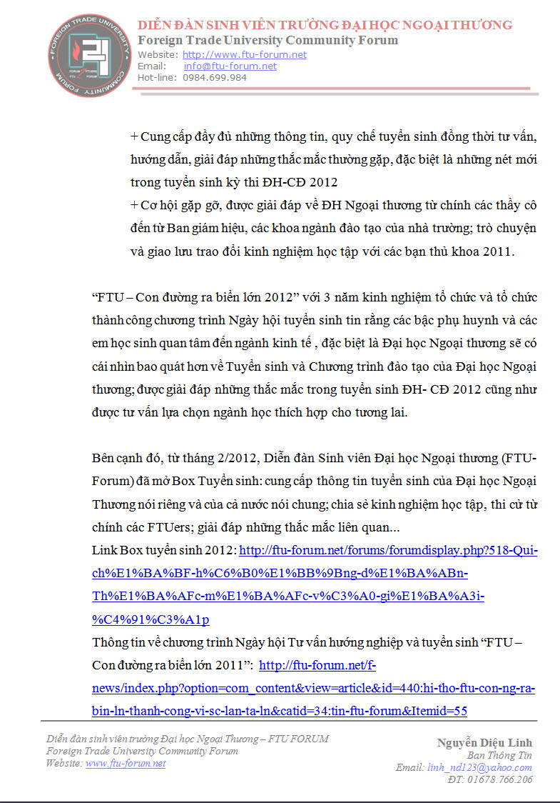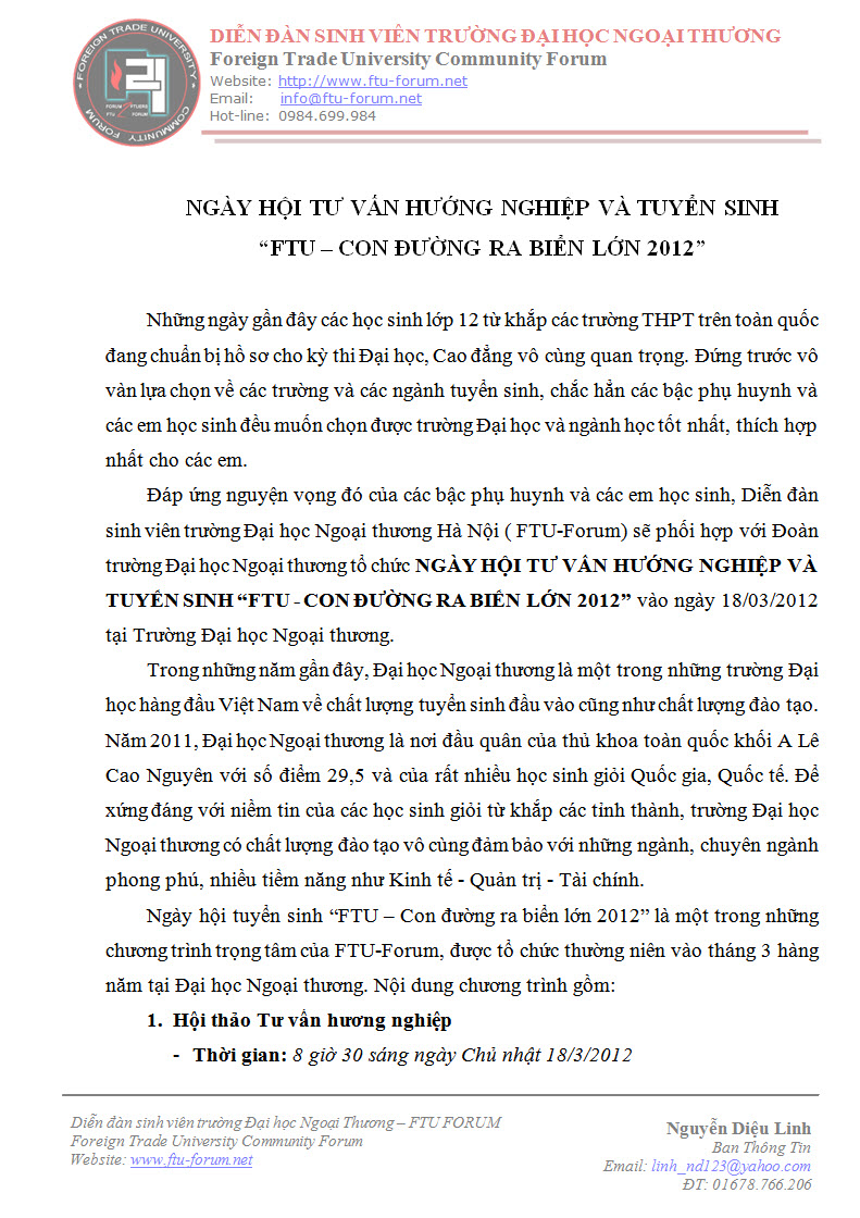 Dưới đây là toàn bộ thông báo về ngày hội TƯ VẤN HƯỚNG NGHIỆP VÀ TUYỂN SINH “FTU – CON ĐƯỜNG RA BIỂN LỚN 2012” của trường Đại học Ngoại thương: